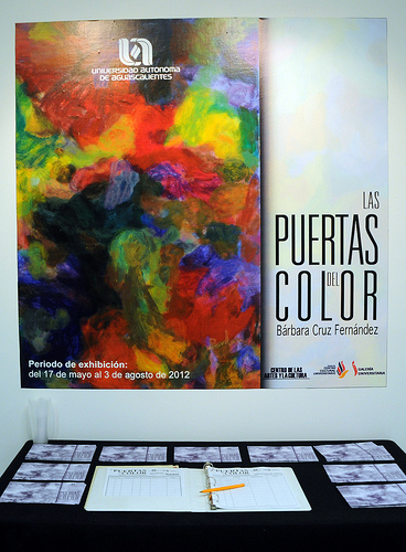 Con la presencia de la artista Bárbara Cruz Fernández, Mario Andrade Cervantes, rector de la UAA, y Javier Avelar, secretario general de la UAA, se llevó a cabo el corte de listón de la exposición temporal Las puertas del color, la cual estará en exhibición del 17 de mayo al 3 de agosto del presente año.