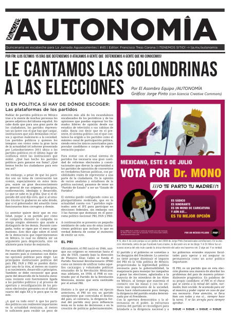 El suplemento Autonomía, le canta las golondrinas a las elecciones con un texto didáctico acerca sobre las plataformas de los tres grandes partidos, para estar bien informados al momento de ejercer el voto. Además, las razones por las que un joven votaría por alguno de los tres candidatos punteros a la presidencia, ejerciendo el voto útil y dejando de lado la posibilidad de anularlo.