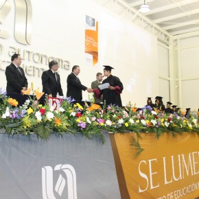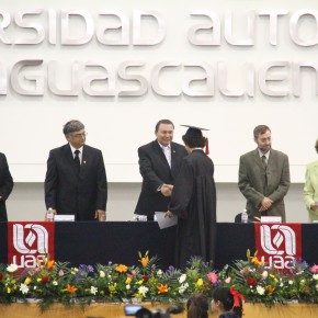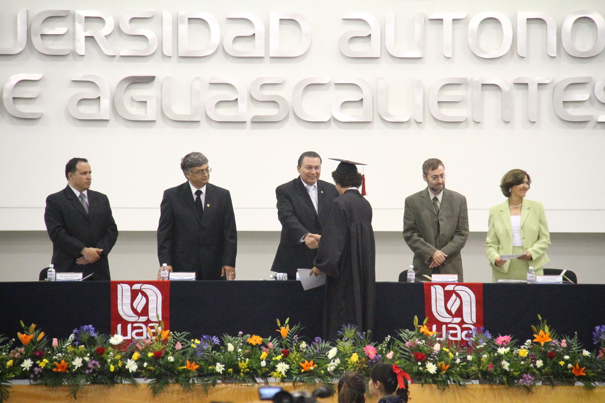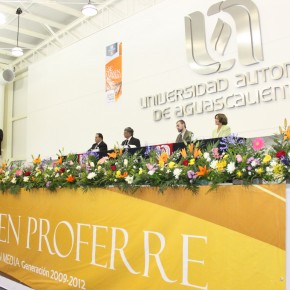 En la ceremonia de entrega de reconocimientos compartieron presídium con el rector de la UAA y decano del CEM, Eugenio Pérez Molphe Balch, miembro de la Junta de Gobierno y Lilia Trespalacios Sosa, secretaria administrativa del Centro de Educación Media.