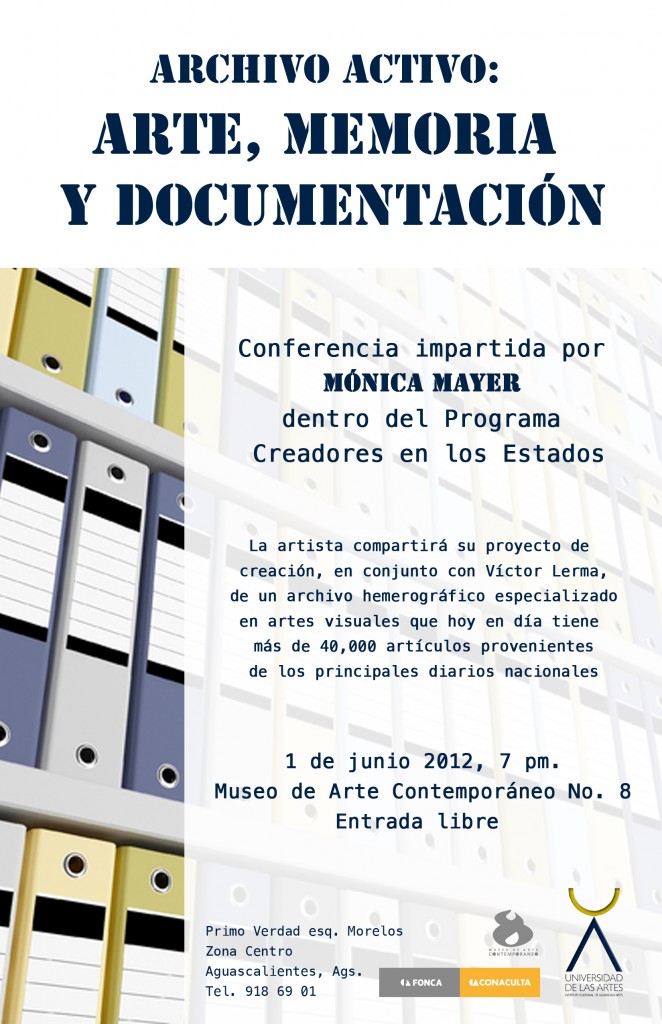 El Instituto Cultural de Aguascalientes invita a la conferencia magistral que bajo el título de “Arte, memoria y documentación” impartirá la maestra Mónica Mayer en el Museo de Arte Contemporáneo No. 8. este viernes 1 de junio a las 19:00 hrs.