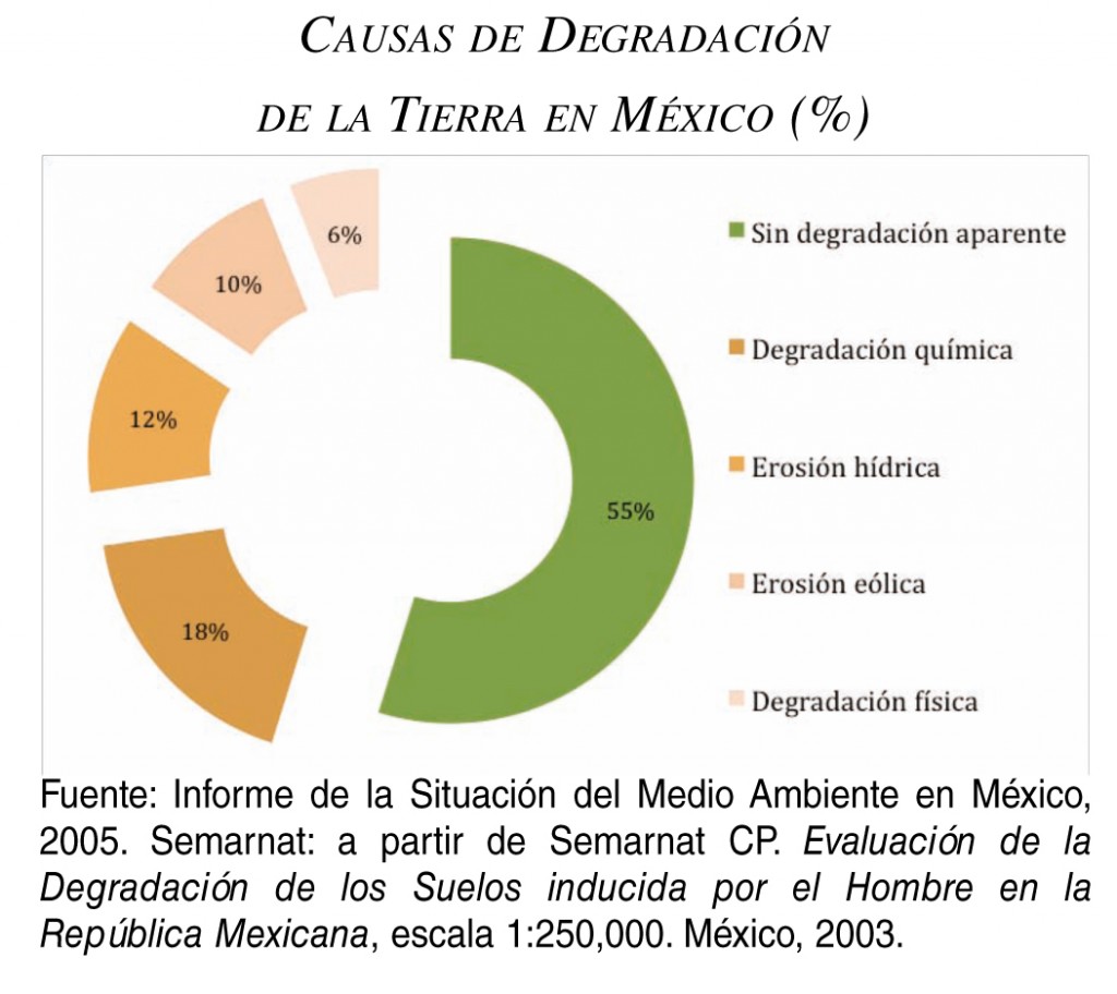 A su vez, la degradación de la tierra se define como la reducción o la pérdida de la productividad biológica o económica de las tierras secas. En México, la degradación que predomina en los suelos es la química con el 17.9%, causada principalmente por las actividades agrícolas; le sigue, en importancia, la erosión hídrica (11.8%), la erosión eólica (9.5%) y, finalmente, la degradación física (6 por ciento).