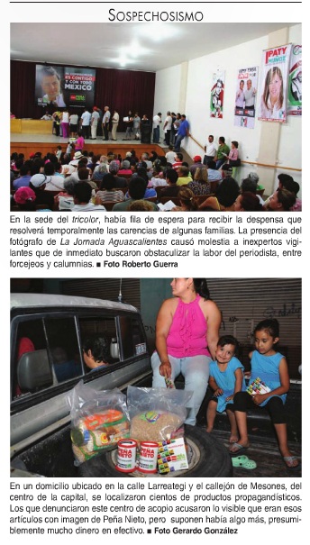 (foto Roberto Guerra) En la sede del tricolor, había fila de espera para recibir la despensa que resolverá temporalmente las carencias de algunas familias. La presencia del fotógrafo de la Jornada Aguascalientes causó molestia a inexpertos vigilantes que de inmediato buscaron obstaculizar la labor del periodista, entre forcejeos y calumnias.