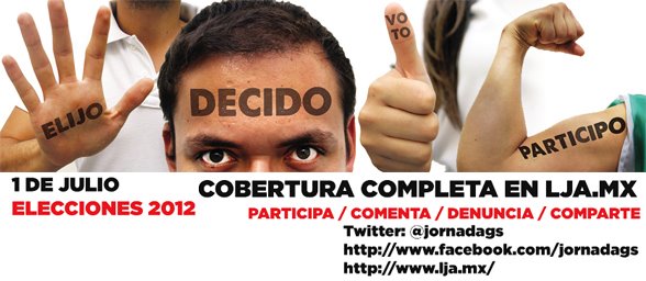 La Jornada Aguascalientes tiene la cobertura completa del proceso electoral del presente 1ero de Julio por medio de LJA.mx, Twitter @jornadags y nuestra página en Facebook con actualizaciones en tiempo real a lo largo del día, además de dar cabido y voz a las denuncias ciudadanas compartidas a través de nuestros diferentes medios. Reportes, fotos, grabaciones, testimonios serán difundidos por los diversos espacios de La Jornada Aguascalientes. La conversación está a un comentario, update o tuit de distancia. Sólo con La Jornada Aguascalientes.