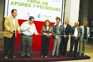 Estela Ruiz Esparza Padilla, secretaria de Administración Municipal, y Juan Carlos Medina Mazzoco, delegado de la Comisión Nacional para la Protección y Defensa de los Usuarios de Servicios Financieros (Condusef), pusieron en marcha la feria de afores y pensiones en la sede del Ayuntamiento capital.