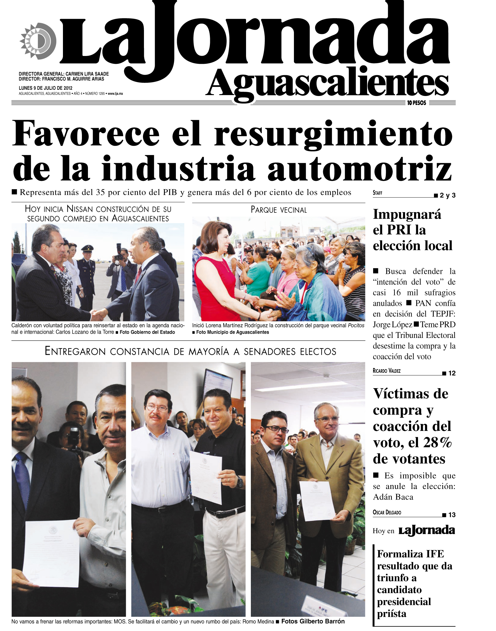 Confirman a Calderón.- En su cuenta regresiva, Felipe Calderón Hinojosa estará este día en Aguascalientes para colocar la primera piedra de lo que será la segunda planta de Nissan. Desde el sábado pasado se cercó el punto del evento a fin de extremar las medidas de seguridad. De antemano, el mensaje que tendría Carlos Lozano Calderón es el del reconocimiento y de la colaboración hasta el final de su sexenio.