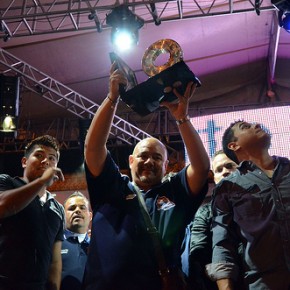 El equipo de casa celebra con el Trofeo Aro de Pelota de la Zona Norte frente a la afición hidrocálida.