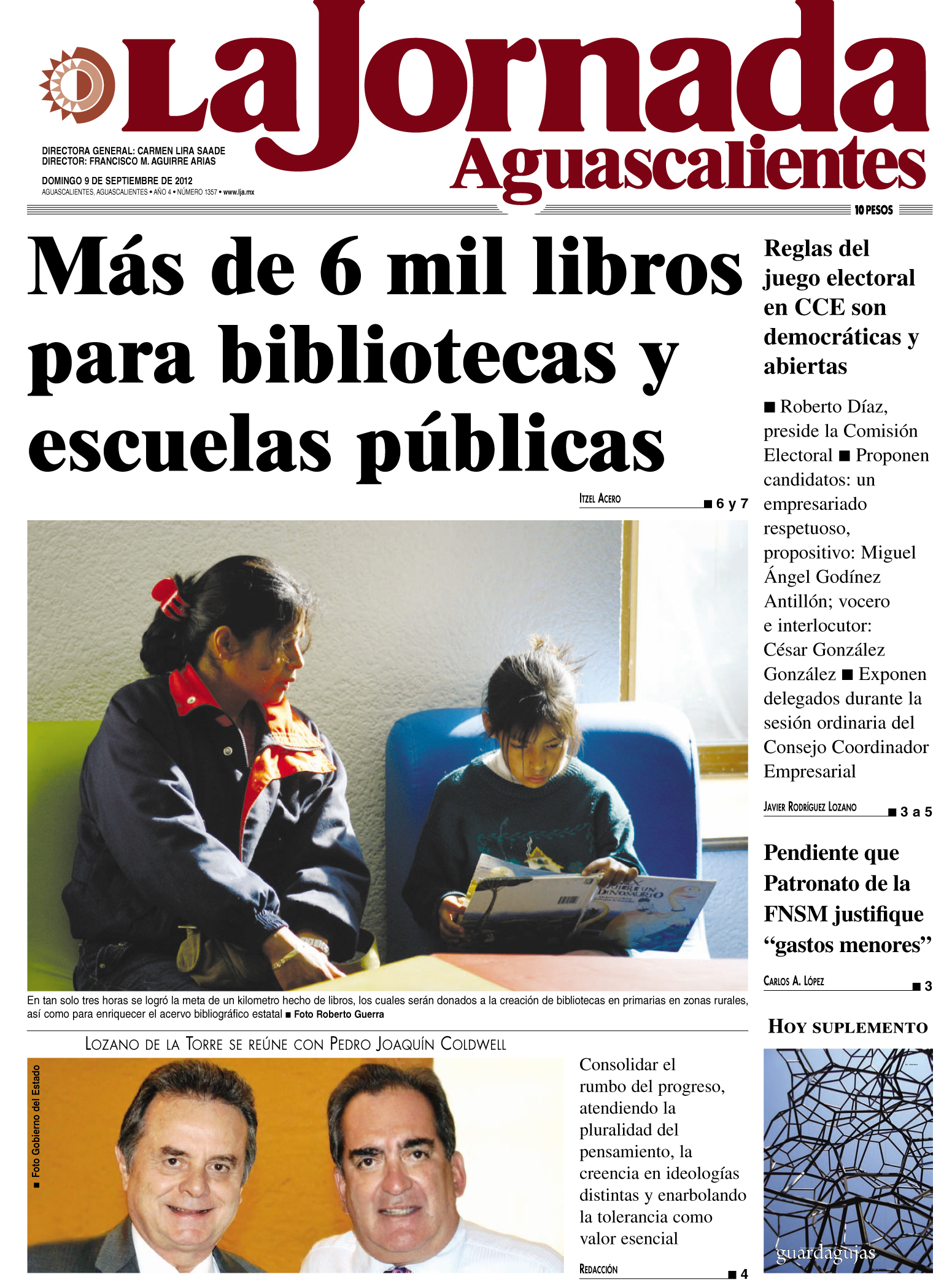 Hemeroteca Actualizado: 09/09/2012 LJA 09/09/2012 Por La Jornada Aguascalientes 09/09/2012 Share FacebookTwitterPinterestWhatsApp La Jornada Aguascalientes Te podría interesar HemerotecaStaff - 05/12/2025Aguascalientes, tercera entidad con más investigaciones por faltas administrativas y más en LJA.MX, edición 5/12/2025 HemerotecaRedacción - 04/12/2025Leonardo Montañez presenta su Primer Informe al frente de la Presidencia Municipal y más en LJA.MX, edición 4/12/2025 HemerotecaRedacción - 03/12/2025Juan Carlos Arredondo, próximo rector de la UAA y más en LJA.MX, edición 3/12/2025 HemerotecaRedacción - 02/12/2025Violencia digital y MeToo evidencian pendientes urgentes para la igualdad en México y más en LJA.MX, edición 2/12/2025 El ejemplar del día de hoy septiembre 9, 2012 Puedes consultar el pdf aquí: Share FacebookTwitterPinterestWhatsApp RELACIONADOS ¿La nueva Ley de Extorsión pone en riesgo las libertades informativas? APRO APRO - 05/12/2025 0 Los funcionarios públicos, por su propia naturaleza y por el cargo que ocupan, están bajo escrutinio. La crítica (cuando es verídica, razonada y... Read more La dupla Sheinbaum-Godoy: del control en la CDMX al Poder Judicial nacional APRO APRO - 05/12/2025 0 La ratificación de Godoy en el Senado abre la posibilidad de que se repita la fórmula política que aplicó junto a Claudia Sheinbaum... Read more Una nueva fiscal: Ernestina Godoy APRO APRO - 05/12/2025 0 Alejandro Gertz Manero, como embajador, nos va a representar dignamente. Se habla de que será enviado a Alemania, lugar de origen de sus... Read more Sheinbaum se reunirá con Trump en su viaje para el sorteo del Mundial 2026 APRO APRO - 05/12/2025 0 La presidenta también tendrá un encuentro con el primer ministro de Canadá, Mark Carney, donde podrían tratar temas como el T-MEC La presidenta Claudia... Read more No hay razón para bloqueos en cruces internacionales: Secretaría de Gobernación Sociedad y Justicia Staff - 05/12/2025 0 SEGOB afirmó que ya atendió planteamientos de productores sobre la nueva Ley de Aguas y mantiene mesas permanentes de diálogo El Gobierno federal... Read more La coordinación estatal de becas para el bienestar informó avances del operativo de entrega de tarjetas Sociedad y Justicia Staff - 05/12/2025 0 42.12% de avance en reposiciones de tarjetas Operativos en 192 escuelas y más de 14 mil tarjetas por entregar Expansión histórica del programa... Read more Previous articleguardagujas en LJANext articleLa Purísima… Grilla [09/09/12]: Nos vamos a poner hasta el hocico - Advertisement - - Advertisement - Recientes en LJA.MX APROAPRO - 05/12/2025¿La nueva Ley de Extorsión pone en riesgo las libertades informativas? Los funcionarios públicos, por su propia naturaleza y por el cargo que ocupan, están bajo escrutinio. La crítica... APRO La dupla Sheinbaum-Godoy: del control en la CDMX al Poder Judicial nacional APRO - 05/12/2025 APRO Una nueva fiscal: Ernestina Godoy APRO - 05/12/2025 APRO Sheinbaum se reunirá con Trump en su viaje para el sorteo del Mundial 2026 APRO - 05/12/2025 Sociedad y Justicia No hay razón para bloqueos en cruces internacionales: Secretaría de Gobernación Staff - 05/12/2025 - Advertisement - MÁS INFORMACIÓN EN LJA.MX - Advertisement -
