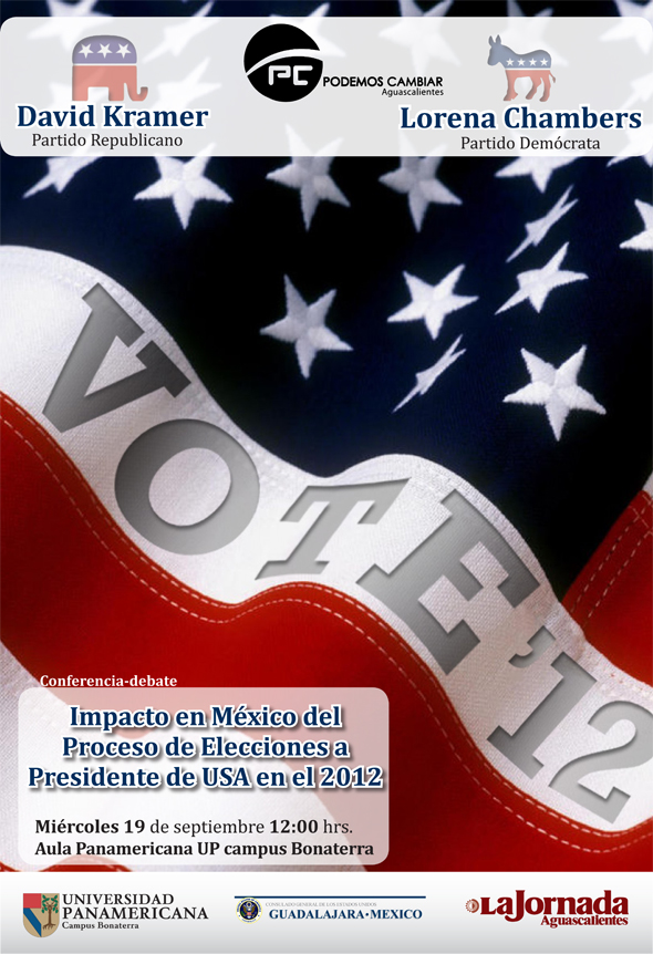 La Jornada Aguascalientes y Podemos Cambiar Aguascalientes invitan a la conferencia-debate Impacto en México del Proceso de Elecciones USA en el 2012 impartida por David Kramer y Lorena Chambers, representantes respectivamente del partido republicano y democráta. En la ponencia se tratarán temas el teme electoral estadounidense con un enfoque relativo a México, como por ejemplo el papel de la comunidad Hispánica en este proceso o como afectaría la relación bilateral de ambos países. Por supuesto, los conferencistas buscan provocar el debate e intercambio de ideas entre los asistentes.
