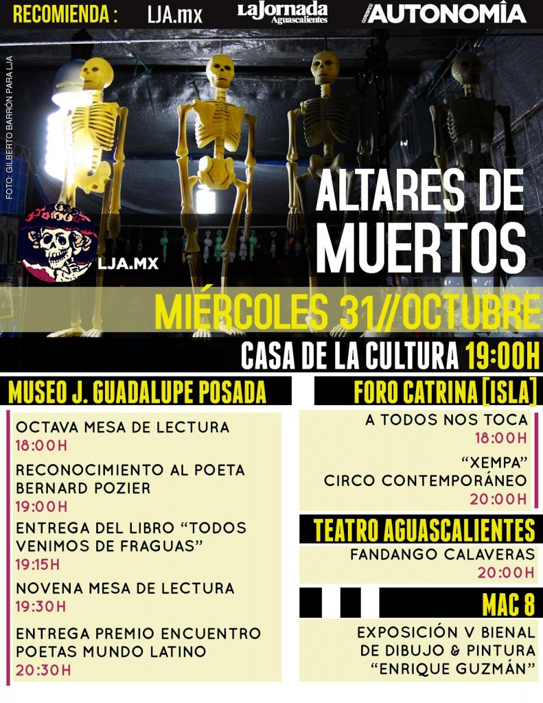 La Jornada Aguascalientes, /AUTONOMÍA y LJA.mx tienen la agenda curada para el lunes miércoles 31 de octubre.