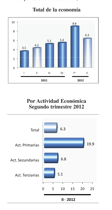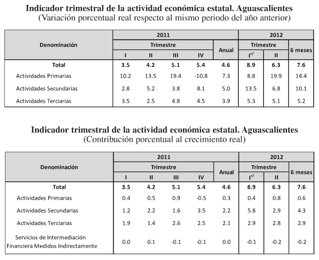 De acuerdo al Indicador Trimestral de la Actividad Económica Estatal (ITAEE), que elabora el Instituto Nacional de Estadística y Geografía (INEGI), Aguascalientes mostró un incremento anual de 6.3 por ciento durante el segundo trimestre de 2012, motivado por el comportamiento de las actividades primarias, secundarias y terciarias que crecieron 19.9, 6.8 y 5.1 por ciento, respectivamente.