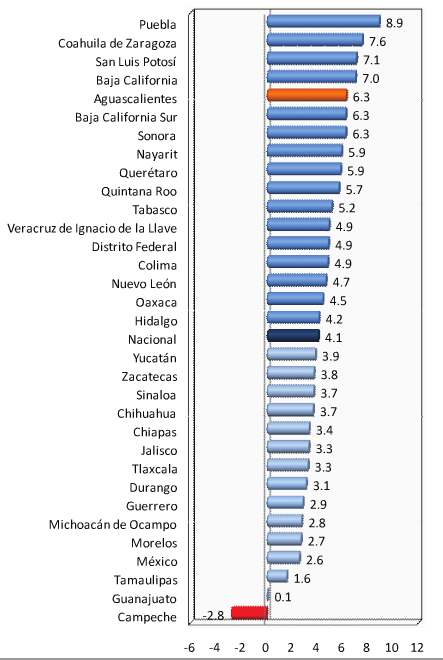 En el segundo trimestre de 2012, Aguascalientes obtuvo la quinta posición, en el total de la economía, con respecto a las 32 entidades federativas; asimismo, aportó 0.07 puntos porcentuales al crecimiento nacional, ubicándose en el lugar número 16.