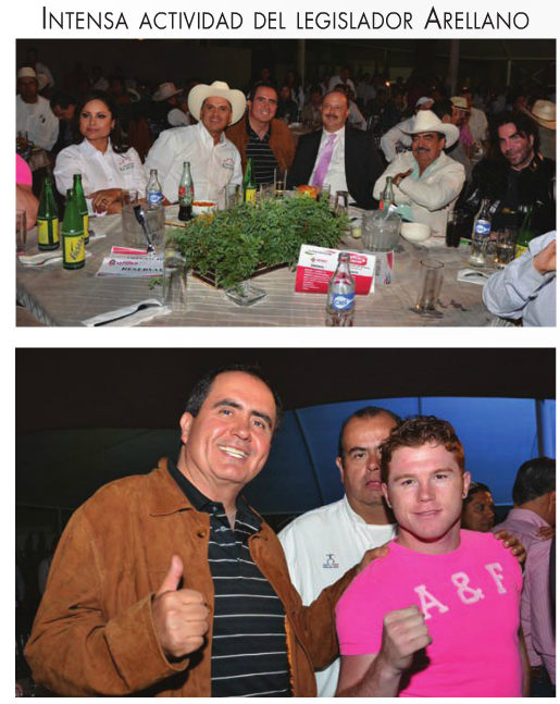 A la redacción de este diario, remitidas por la oficina de Comunicación Social del Congreso del Estado, llegaron estas fotografías que dan cuenta de la intensa actividad del diputado Gabriel Arellano. En la imagen superior, señala el correo: “invitado por el Gobernador de Nayarit, Roberto Sandoval Castañeda y acompañado por el Gobernador de Chihuahua, César Duarte y el Gobernador de Colima, Mario Anguiano, así como del cantante Joan Sebastian, el Boxeador Saúl El Canelo Álvarez y el político Jorge Kahwagi, el diputado Gabriel Arellano compartió la mesa principal durante el evento de presentación de la Fundación RIE (Rehabilitación Integral Equina). Institución que tiene varios reconocimientos a nivel nacional [al] lograr integrar a la vida productiva a personas con discapacidad”. En la segunda imagen, del mismo origen, se indica que el pie de foto debe decir: “El Diputado Gabriel Arellano platicó ampliamente con el campeón del CMB Saúl El Canelo Álvarez durante la presentación de la Fundación RIE en el Estado de Nayarit”. Sin comentarios.