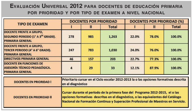 Del total del magisterio evaluado, 575 se situaron en prioridad I, es decir, que requieren atención inmediata en su formación, la cual se tendrá que recibir en el ciclo escolar actual 2012-2013. Así como los docentes prioridad II, los cuales deben ser atendidos a mediano plazo, que resultaron ser mil 954 de los maestros evaluados (77.3 por ciento del total de evaluados).