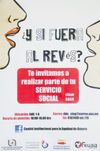 Otra de las actividades es la estrategia performativa “Y si fuera al revés”, en la que alumnos interesados en cubrir un porcentaje de su Servicio Social, recibirán cursos sobre equidad sexogenérica por parte del Comité Institucional para la Equidad de Género, y portarán un día a la semana una playera con la leyenda “Y si fuera al revés”. El objetivo es que los jóvenes interactúen con la comunidad universitaria y divulguen sus vivencias respecto a esta práctica.
