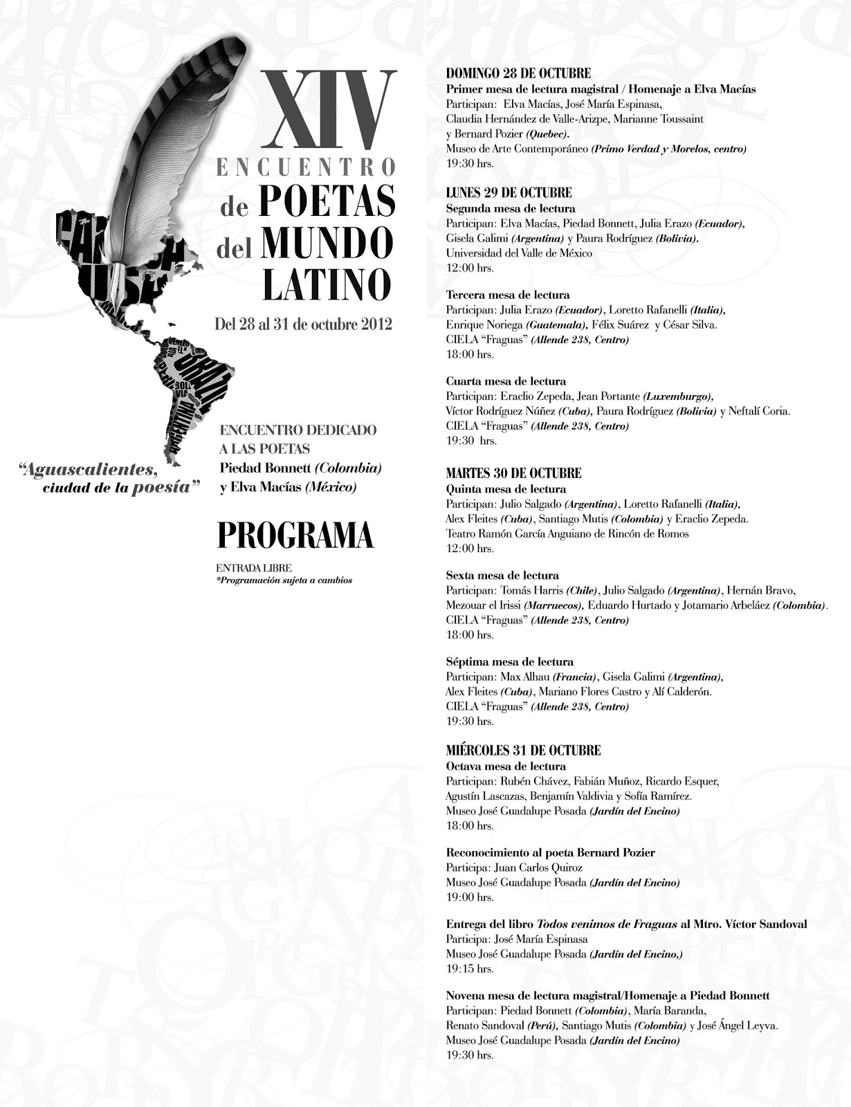 La decimocuarta edición del Encuentro de Poetas del Mundo Latino se realizará en Aguascalientes del 28 al 31 de octubre, en el marco del Festival de Calaveras, y por primera vez la entidad será sede de este encuentro, que se realiza en conjunto con el Consejo Nacional para Cultura y las Artes (Conaculta), a través de la Coordinación Nacional de Literatura y del Seminario de Cultura Mexicana.