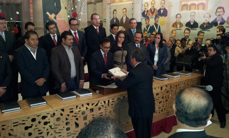 • Juan Manuel Gómez Morales, diputado presidente de la Mesa Directiva, recibió el documento de manos del Ingeniero Carlos Lozano de la Torre.