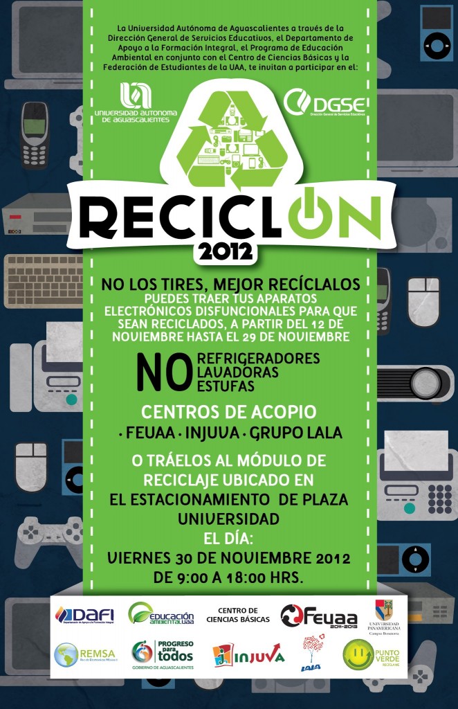 La Universidad Autónoma de Aguascalientes participa por cuarta ocasión consecutiva en la campaña de recolección de residuos electrónicos, Reciclón 2012, con la que se busca contribuir en el adecuado tratamiento y confinamiento de desechos peligrosos, mitigando de esta manera el cambio climático.