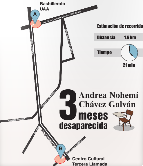El pasado 27 de octubre se cumplieron tres meses de la desaparición en la ciudad de Aguascalientes de Andrea Nohemí Chávez Galván, quien salió de la prepa de la UAA (prepa Petróleos) a eso de las 2 de la tarde, después de asistir a una asesoría para presentar un examen de física, haciéndolo con rumbo a avenida Independencia, pues su destino ese día era ensayar una obra en el café Tercera Llamada ubicado en el centro, en la calle Álvaro Obregón. Sus compañeros coinciden en señalar que Andrea estaba entusiasmada con el prospecto de su obra de teatro. Nada en su conducta, en su forma de ser o en la manera como procedió ese día apunta a una estrategia de fuga de su hogar. ¿Quién se fuga de casa yendo primero a pagar un examen extraordinario y asistiendo a la clase que le prepara para ello? Las adolescentes quienes se fugan de su hogar salen directamente de éste, llevándose consigo las posesiones o por lo menos un objeto personal que valoran y teniendo al menos una confidente con respecto a sus intenciones. No fue el caso. La desaparición de Andrea Nohemí ha resultado relevante por varias razones.