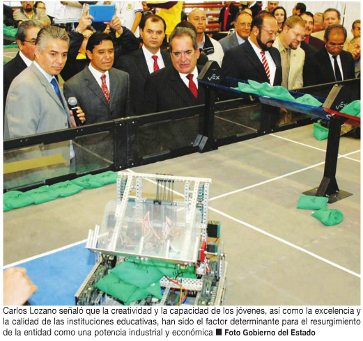 La creatividad y la capacidad de los jóvenes de Aguascalientes, así como la excelencia y la calidad de las instituciones educativas, han sido el factor determinante para el resurgimiento de la entidad como una potencia industrial y económica, señaló Carlos Lozano de la Torre, gobernador del estado, al encabezar el arranque del Tercer Campeonato Internacional de las Universidades Tecnológicas, Reeduca-VEX Robotics.