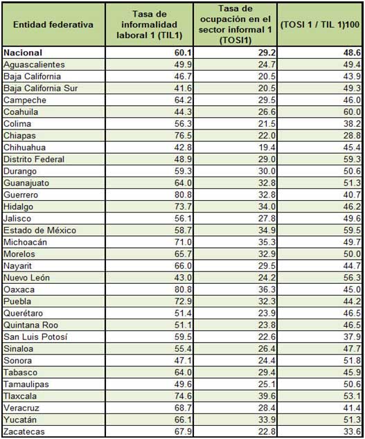 Las entidades federativas con los valores más bajos dela Tasade Informalidad Laboral (TIL1) durante el tercer trimestre de 2012 se ubican en la frontera norte del país, región altamente ligada económicamente con los circuitos de la economía mundial y que cuenta con mercados laborales más estructurados: Baja California Sur (41.6%), Chihuahua (42.8%), Nuevo León (43.0%), Coahuila (44.3%) y Baja California (46.7%). En el otro extremo, las entidades con los mayores valores dela TIL1 fueron: Oaxaca (80.8%), Guerrero (80.8%), Chiapas (76.5%), Tlaxcala (74.6%) e Hidalgo (73.7%), de las regiones sur y centro del país, con economías menos modernas y mercados laborales menos sólidos.
