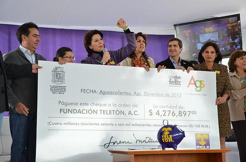 Lorena Martínez, alcaldesa de Aguascalientes, hizo entrega de un cheque por 4 millones 276 mil pesos a favor del programa Teletón, gracias al respaldo y aportación voluntaria de los 7 mil 300 trabajadores del Ayuntamiento de la capital, con lo que se contribuye a la creación de infraestructura y el fortalecimiento de programas de atención para niños con algún tipo de discapacidad.