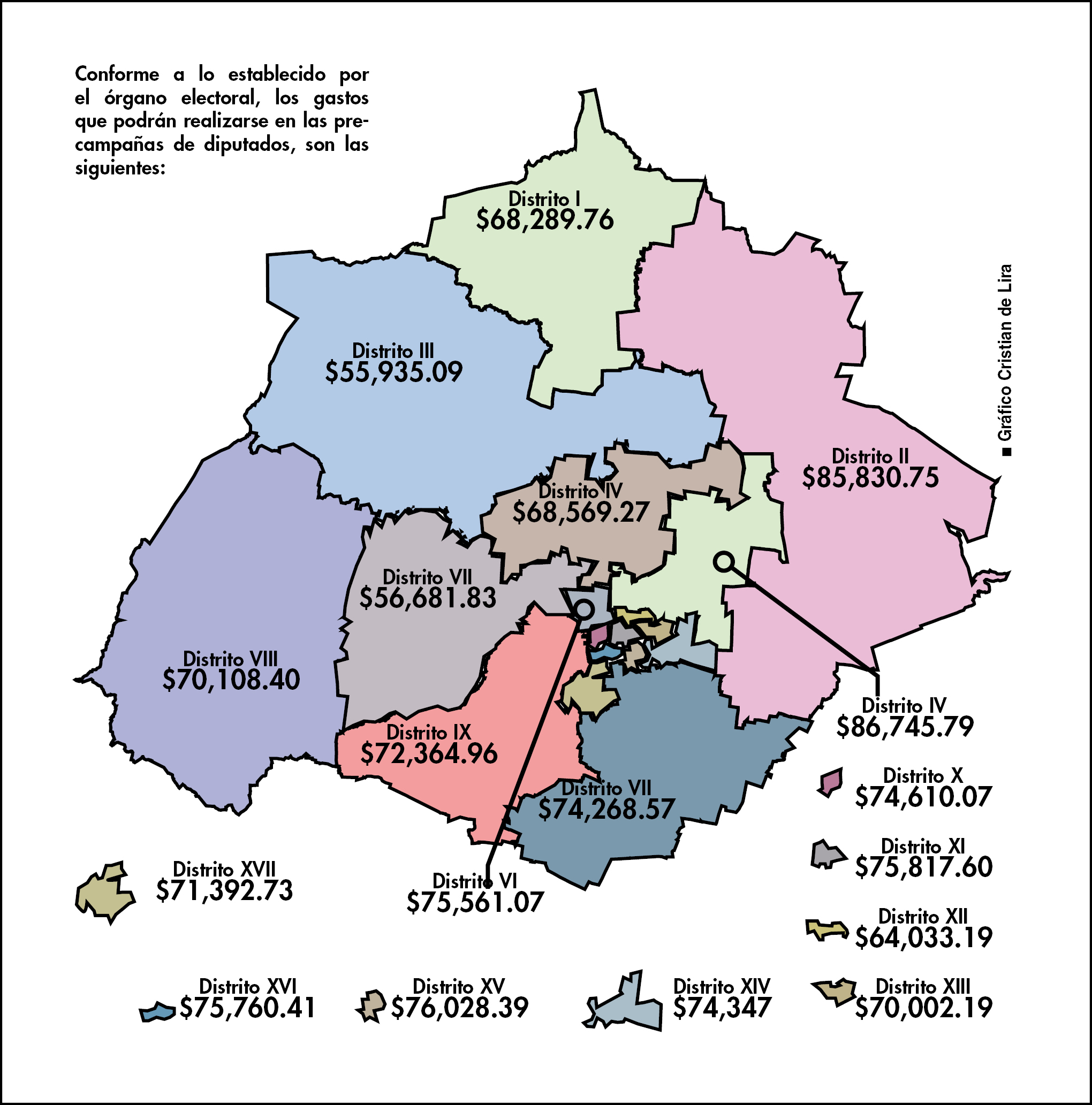 Conforme a lo establecido por el órgano electoral, los gastos que podrán realizarse en las precampañas de diputados, son las siguientes: Distrito I 68 mil 289.76 pesos, Distrito II 85 mil 830.75 pesos, Distrito III 55 mil 935.09 pesos, Distrito IV 68 mil 569.27 pesos, Distrito V 86 mil 745.79 pesos, Distrito VI 75 mil 561.07, Distrito VII 56 mil 681.83 pesos, Distrito VIII 70 mil 108.40 pesos, Distrito IX 72 mil 364.96 pesos, Distrito X 74 mil 610.07 pesos, Distrito XI 75 mil 817.60 pesos, Distrito XII 64 mil 33.19 pesos, Distrito XIII 70 mil 2.19 pesos, Distrito XIV 74 mil 347 pesos, Distrito XV 76 mil 28.39 pesos, Distrito XVI 75 mil 760.41 pesos, Distrito XVII 71 mil 392.73 pesos y Distrito XVIII 74 mil 268.57 pesos.