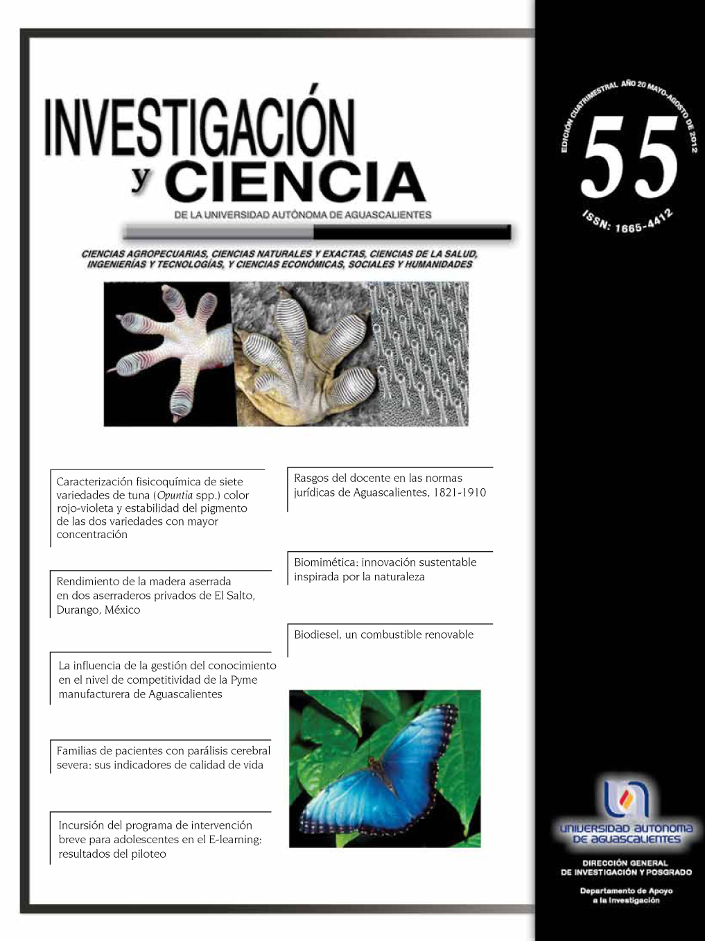 Por otra parte, el número más reciente de esta publicación ofrece artículos sobre: la caracterización fisicoquímica de siete variedades de tuna, el rendimiento de la madera en dos aserraderos privados de El Salto en Durango, los rasgos del docente en las normas jurídicas de Aguascalientes de 1821 a 1910, la biomimética como innovación sustentable, el biodiesel, la influencia de la gestión del conocimiento en el nivel de competitividad de la PyME manufacturera de Aguascalientes. Además, textos sobre familias de pacientes con parálisis cerebral severa y sus indicadores de calidad de vida, así como la incursión del programa de intervención breve para adolescentes en la E-learning.