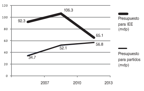 El análisis es el siguiente: según los documentos del propio IEE y con los que cuentan algunos especialistas en el tema, se muestra el financiamiento que se ha destinado a los partidos políticos en comparación con los entregados con el gasto de operación del IEE, y son los siguientes: en 2007, 34.7 millones de pesos para los partidos políticos y 92.3 para el IEE; en 2010 fueron 52.1 para los partidos políticos y 106.3 al IEE, y en 2013 son 56.8 para partidos políticos y 65.1 para el IEE, con lo que se demuestra que la asignación de los recursos por parte de las autoridades a los organismos electorales no es la prioridad, pero sí la asignación de recursos a los partidos políticos.