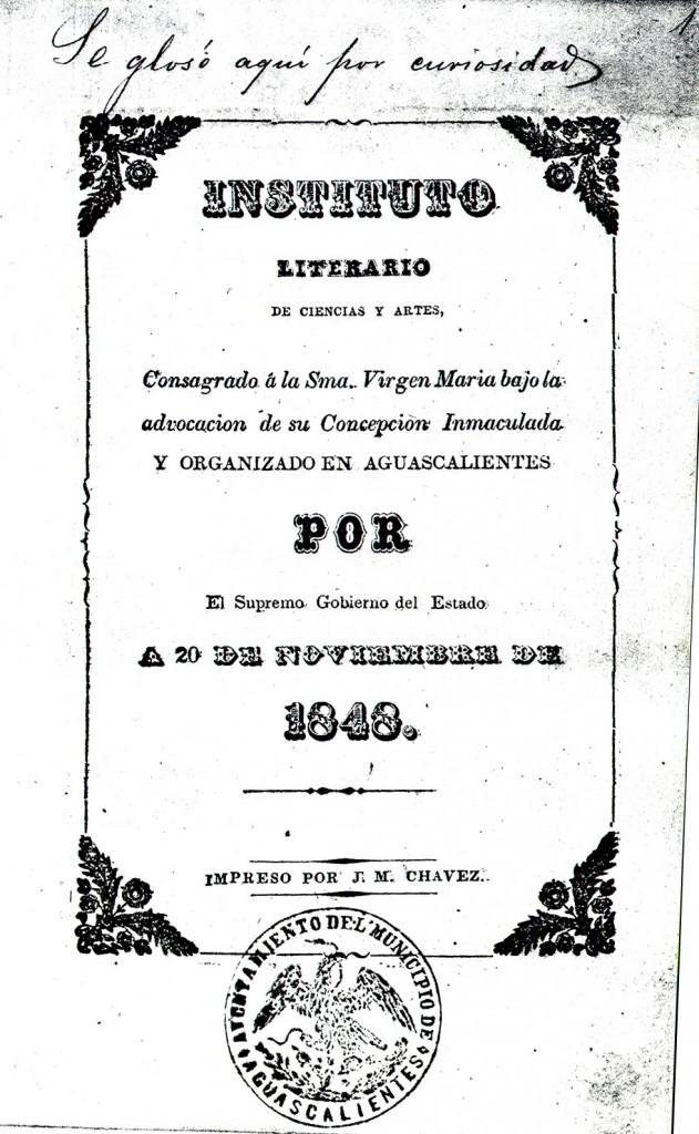 20 DE NOVIEMBRE DE 1848. DECRETO. Gracias a esa favorable circunstancia, las aspiraciones de los liberales por reformar el plan de estudios del Colegio de Aguascalientes culminó en la promulgación del decreto de esta fecha, otorgado por el gobierno de Zacatecas. Se reproduce en este espacio la carátula del documento fundacional (12 páginas) localizado por el compilador histórico José María Mora Ruiz, hecho que hizo público por diversos medios desde 1991 y una copia completa del cual me obsequió en 1996.