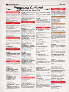 Cabe hacer mención que en el marco de la FNSM 2012, el programa cultural integró 481 actividades entre exposiciones, premios, literatura, música, teatro, danza y corridas de toros, esta última fue declarada como Patrimonio Cultural Inmaterial del Estado. Todas estas actividades registraron la asistencia de 68 mil 543 personas con la participación de más de 2 mil artistas. Los tres festivales de música registraron 76 actividades con un total de 5 mil 581 participantes.
