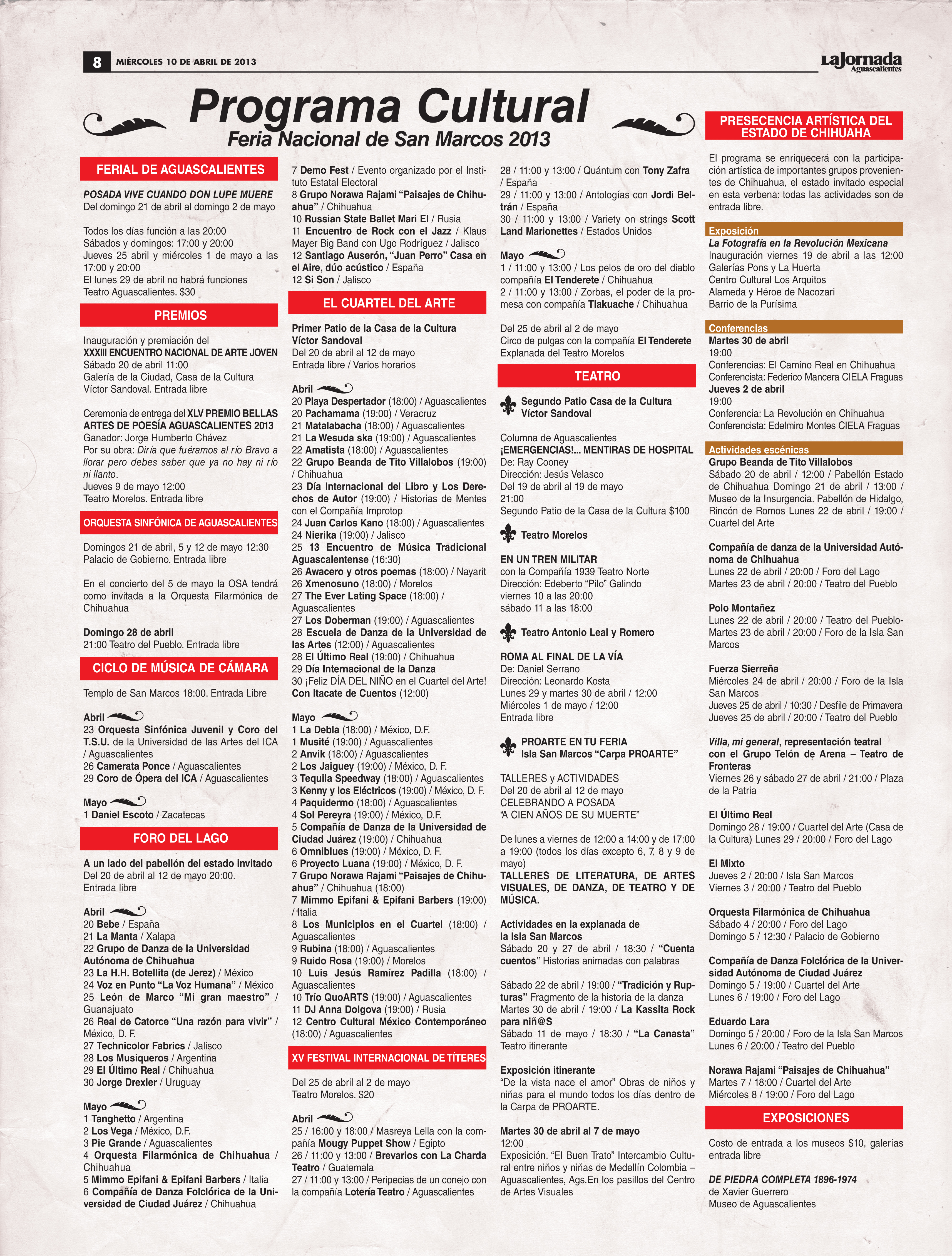 Toda la gama de disciplinas artísticas y géneros encuentra un lugar en la Feria Nacional de San Marcos 2013, dando cabida a propuestas novedosas y contemporáneas, así como al folclor y al arte popular. En esta ocasión, el Instituto Cultural de Aguascalientes tendrá a su mando alrededor de 300 actividades de teatro, danza, música, literatura y artes plásticas en 25 lugares diferentes.