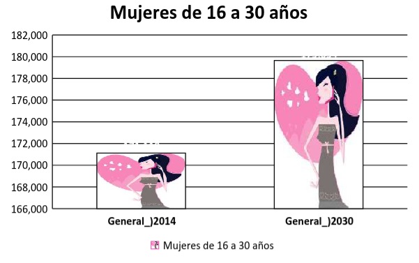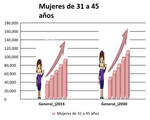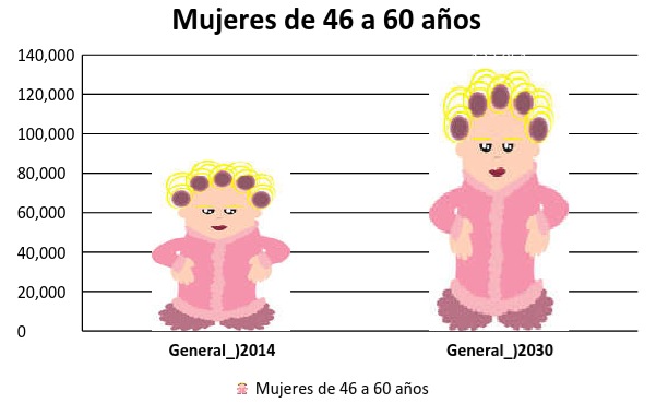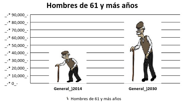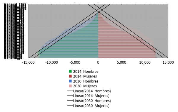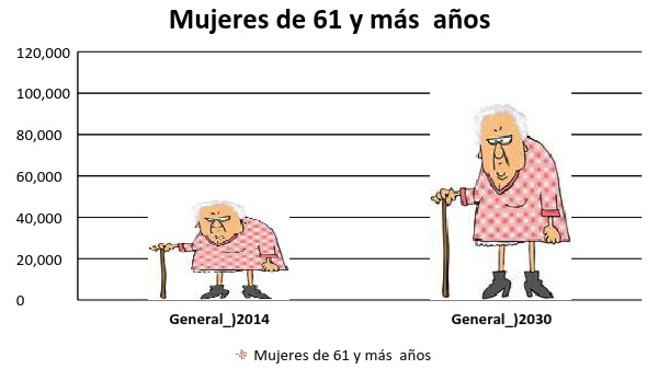- Los adultos mayores se duplicarán, pasarán de 95 mil 774 en el 2014 a 185 mil 373 en el próximo 2030. El proceso de envejecimiento poblacional se aprecia en este grupo de 61 años y más, que representa la necesidad de hacer previsiones financieras, de atención a la salud, de infraestructura para hacer accesible la ciudad. Sólo de mujeres mayores de 61 años serán en el 2030 más de 100 mil, que era la población total de Aguascalientes hace 100 años.