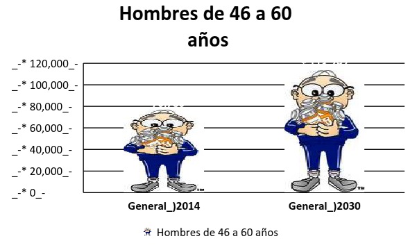 - Los adultos de entre 46 y 60 años que suman al inicio del año 2014, 163 mil 358 personas, seguirán creciendo de manera sostenida y se espera que lleguen a los 246 mil 343 en el 2030. De hecho la mitad del incremento de población que tendrá Aguascalientes para los próximos tres años tendrá estas edades maduras, lo que nos hace pensar en la necesidad de conocer las demandas emergentes de estos grupos etarios, en expansión.