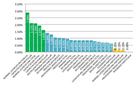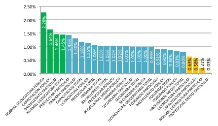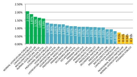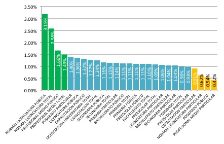 No obstante lo anterior, para el ciclo 2010-2011, según el Sistema Nacional de Información Estadística Educativa, Aguascalientes continuaba al frente de la matrícula en estudios normalistas del sector público, pero sólo cubriendo al 2.04%.