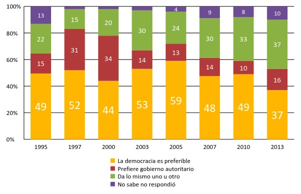 Durante el último quinquenio del siglo pasado el Latino-barómetro llevó a cabo la primera oleada de encuestas en América Latina que incluyó a países como: Argentina, Brasil, Chile, México, Paraguay, Perú, Uruguay y Venezuela. Desde entonces, este estudio de opinión ha venido dando cuenta de los cambios en las democracias de los países latinoamericanos, durante las últimas décadas. El caso de México, es uno donde la alternancia en el poder no ha producido un impacto  inmediato sobre el apoyo a  la democracia, ya que, después de un repunte, se ha venido produciendo una pérdida sostenida. Para el 2013, México ha perdido doce puntos porcentuales  de apoyo a la democracia respecto de su promedio 1995 -2013.