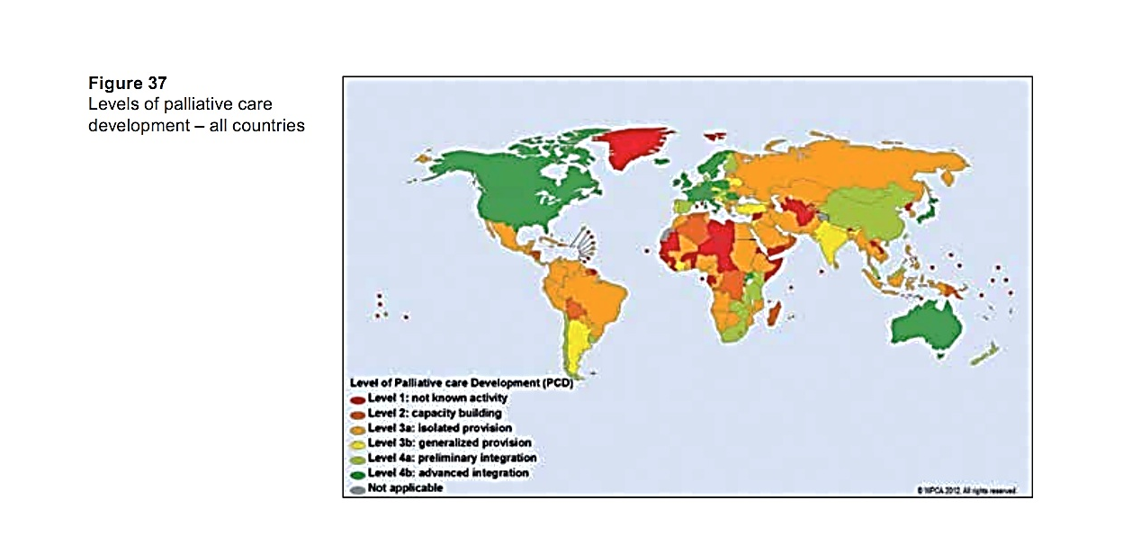 En el caso de México, de acuerdo con la clasificación OMS-WPCA se encuentra en nivel “naranja” correspondiente al que proporciona los cuidados paliativos CP en forma aislada… Tal cual como la mayor parte de América Latina. Lejos aún de países como Argentina y la India en donde la provisión ya es generalizada. Los niveles más avanzados en CP los encontramos en los países nórdicos, en los de lengua inglesa, Japón y parte de Europa. En las dos terceras partes del globo terráqueo apenas se están “construyendo las capacidades” para poder otorgarlos.