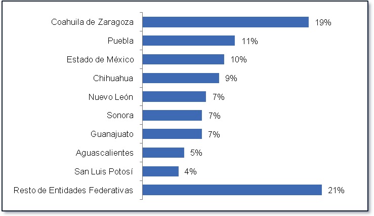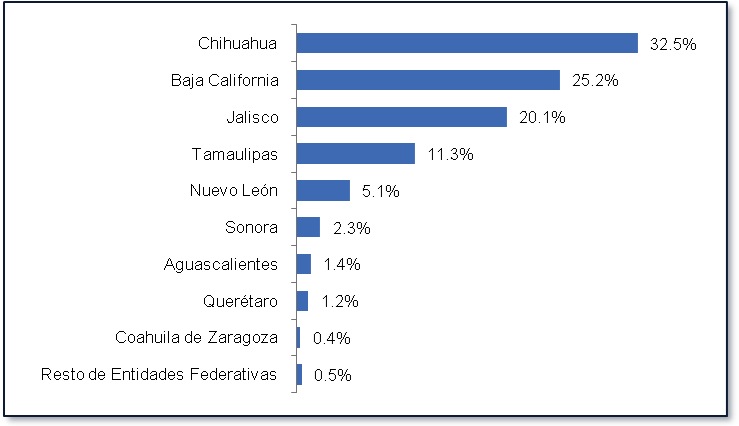 Las Entidades Federativas que destacaron en 2012 por el valor total de sus exportaciones son: Chihuahua con una participación del 13%, seguida de Baja California y Coahuila de Zaragoza con el 10% respectivamente; Campeche con el 9% y Nuevo León con el 8%. Estas cinco entidades concentraron la mitad del valor total de las exportaciones. Las norteñas, en el renglón de las manufacturas industriales y Campeche por el petróleo.