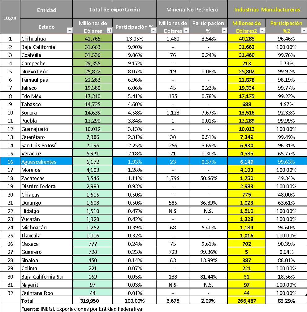 Para el estado de Aguascalientes (16º lugar), el valor total de sus exportaciones asciende a 6,171 millones de dólares (1.93% del total nacional) básicamente obtenido por la exportación de equipo de transporte de las industrias manufactureras, cuya participación es del 5% (8º lugar), sólo por debajo de Coahuila, Puebla, Estado de México, Chihuahua, Nuevo León, Sonora y Guanajuato, con 19%, 11%, 10%, 9%, 7%, 7% y 7% respectivamente. Después de este renglón, aparece en 7º lugar en exportaciones de equipo de cómputo y comunicación con 22.7 millones de dólares cuya suma equivale al 1.4% del total nacional exportado.