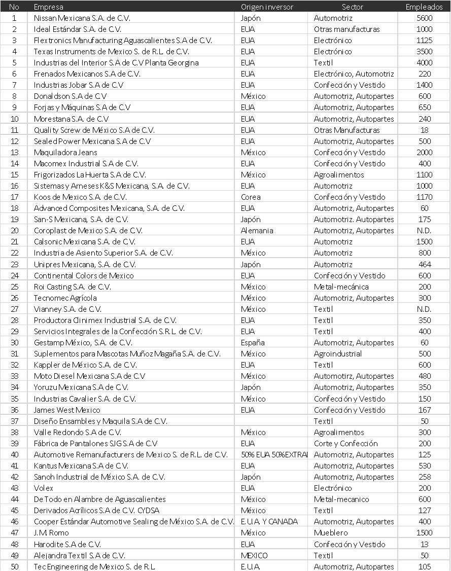 Si bien no se tienen datos de todas las empresas exportadoras, las 50 que OPEXA destaca cuentan con un activo laboral que asciende entre 36 y 40 mil trabajadores; 26 de ellas, más de la mitad, sólo exporta hacia los Estados Unidos. El resto, aparte de exportar hacia los EEUU, también lo hace a otros países del orbe, destacando Canadá, Holanda, Francia, Gran Bretaña, Italia, Alemania, España e Irlanda; de Centroamérica relacionan a Honduras, Panamá, Costa Rica, Guatemala y El Salvador; de Suramérica a Chile, Perú, Argentina, Brasil, Colombia, Venezuela y Ecuador. Finalmente de Asia, por supuesto Japón, China, Hong Kong, Singapur y Taiwán. La mayor exportadora es Nissan que exporta a 36 países los vehículos y partes automotrices que produce en Aguascalientes.