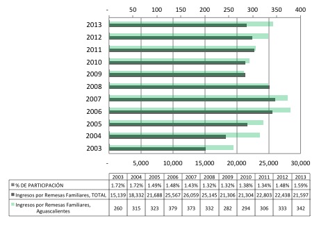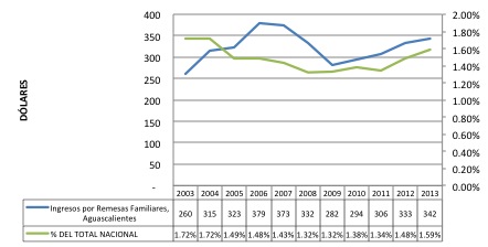 De acuerdo con el registro del Banco de México (Banxico), las remesas familiares enviadas hacia México cayeron en un 3.7% al cerrar el 2013 con sólo 21,597 millones de dólares. La cifra fue inferior a los 22,438.32 millones que en 2012 mandaron al país los mexicanos en el exterior. Lo contrario al caso de Aguascalientes donde las cifras subieron un 2.7% de 333 a 342 millones de dólares anuales, correspondientes a los cierre del 2012 y el del 2013.