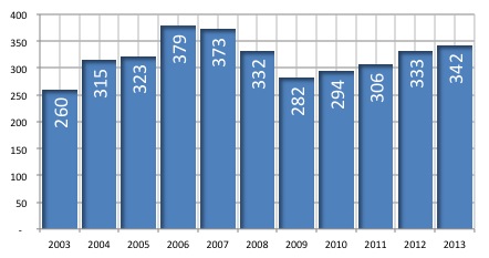 Remesas anuales recibidas en millones de dólares en Aguascalientes 2003-2013