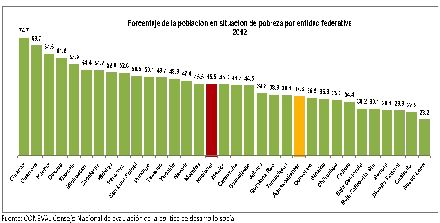 Se han venido destacando elementos clave de la agenda para la Justicia Social como labores propias de la comunidad encaminadas a erradicar la pobreza, promover el pleno empleo, el trabajo decente, la igualdad entre los sexos, el acceso al bienestar social y la justicia social para todos. En Aguascalientes para el 2012 según el CONEVAL, la población en situación de pobreza asciende al 37.8%, cifra inferior al resultado nacional de 45.5%, y por ello ocupando el lugar 22 entre las entidades dada su población en pobreza. Aun así, estamos hablando de casi cuatro de cada diez habitantes. Cuando de pobres hablamos, es mayoría en el caso de los niños y de las mujeres.