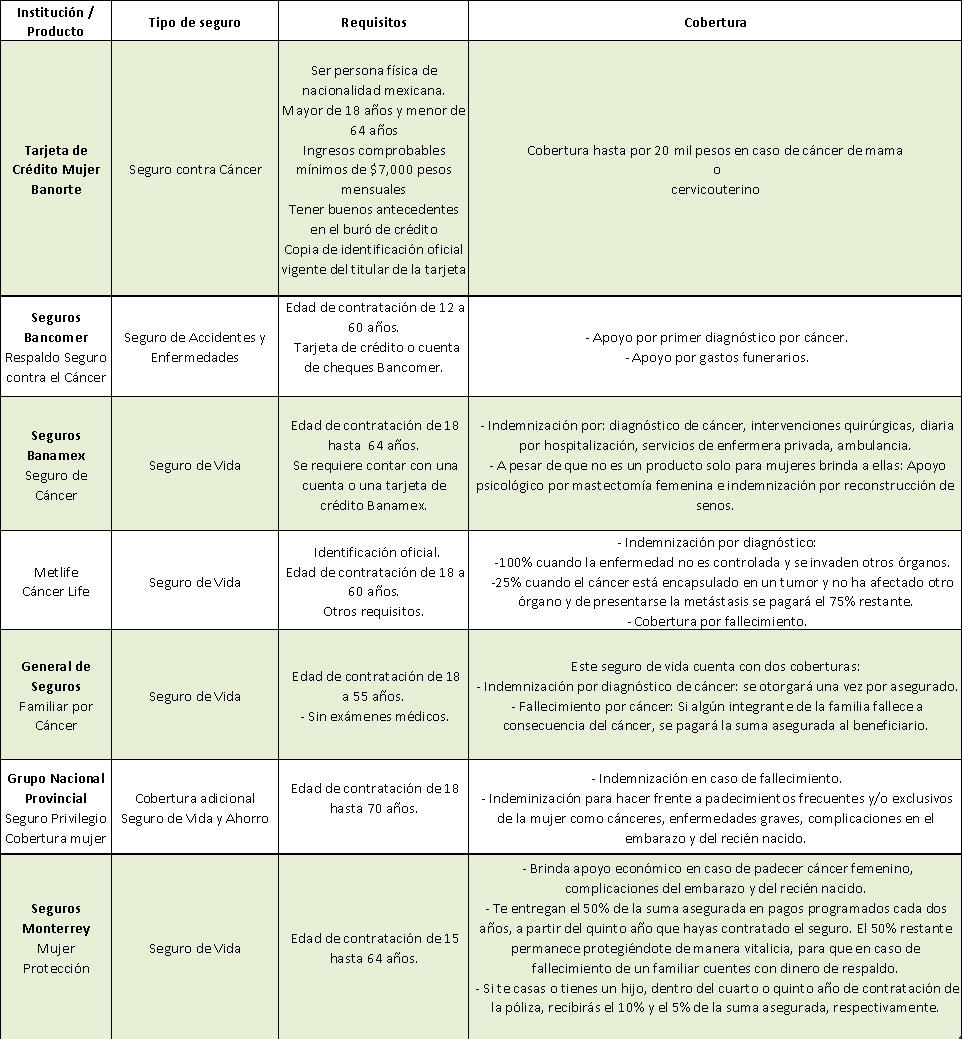 En el mercado existen diversos productos financieros que cubren padecimientos o enfermedades frecuentes y/o exclusivas de la mujer como son cáncer de mama, cáncer cervicouterino, complicaciones en el embarazo y del recién nacido.