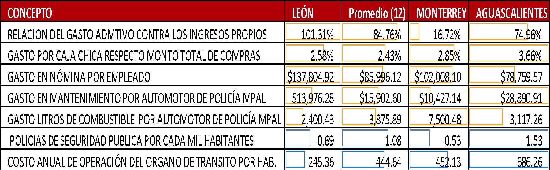 En general, los municipios se gastan una cantidad importante de los ingresos propios en gastos administrativos. En promedio, hasta un 54% se destina a este rubro, y en el caso del municipio de León sólo el 38% de sus ingresos propios se van en ellos (Aguascalientes gasta 76%). Además se pueden detectar gastos de carácter discrecional como el de la “caja chica” que puede ser bastante alto, como en el caso de Aguascalientes que ha llegado a ser de casi 17% (2012), cuando en promedio se manejan del 2 a 7%. Finalmente, los gastos por empleado(a) municipal, que en el caso de León ascienden a 116,835.70 pesos, cifra muy superior a los de Monterrey que llegan tan sólo a los 73,239.51 mil pesos; en Aguascalientes se gastan 71,050.55 pesos, cifra inferior incluso a la del promedio de los municipios evaluados que sumó la cantidad de 74,672.68 pesos.