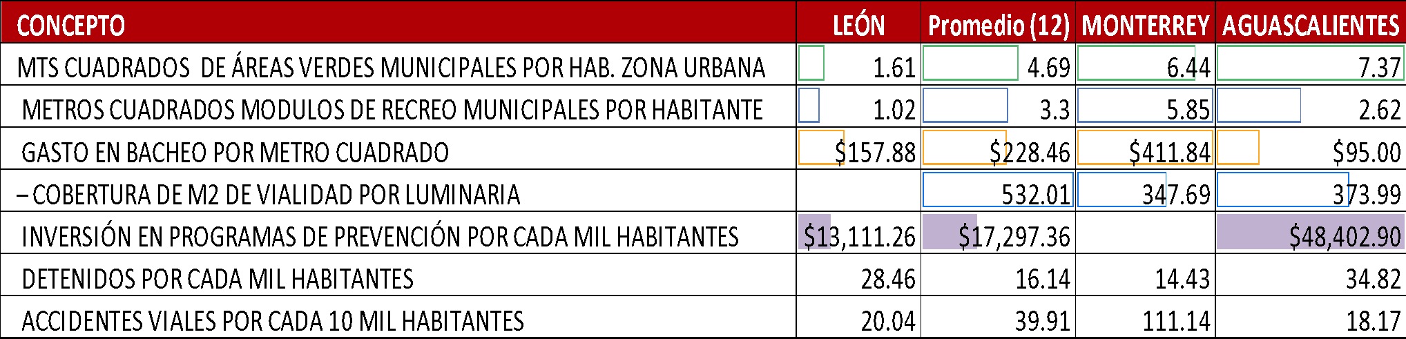 Medidas estratégicas básicas como cuantificar los metros cuadrados de áreas verdes que tiene un municipio en su zona urbana, a sabiendas de que la Organización Mundial de la Salud ha estipulado que deben tenerse un per cápita de entre 9 y 10 metros cuadrados, resulta ser una información relevante, lo mismo si se aspira a tener los mismos metros cuadrados disponibles en módulos de recreo. Y, como podemos apreciar, en el mejor de los casos se cuenta con la mitad de estos valores y en tratándose de una densidad alta, como la que se presenta en el municipio de León, los números se pulverizan en forma lamentable.