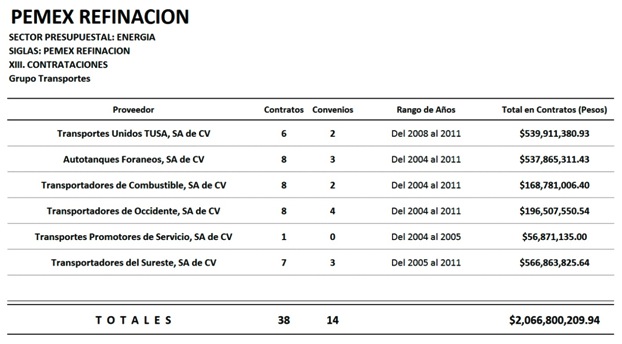Para finalizar, el dirigente apuntó que esta mezquina estrategia que se ha orquestado ha tratado de influir, dividir y minar la unidad que prevalece dentro del Partido Acción Nacional; a su vez trata de controlar a los consejeros de Petróleos Mexicanos con una total concentración de atribuciones para la designación de contratos para la exploración, explotación y distribución de Pemex, tal y como se evidenció en los 38 contratos y 14 convenios de Pemex-Refinación por el monto específico de 2,066,800,209.94 de pesos adjudicados tal y como se anexa: