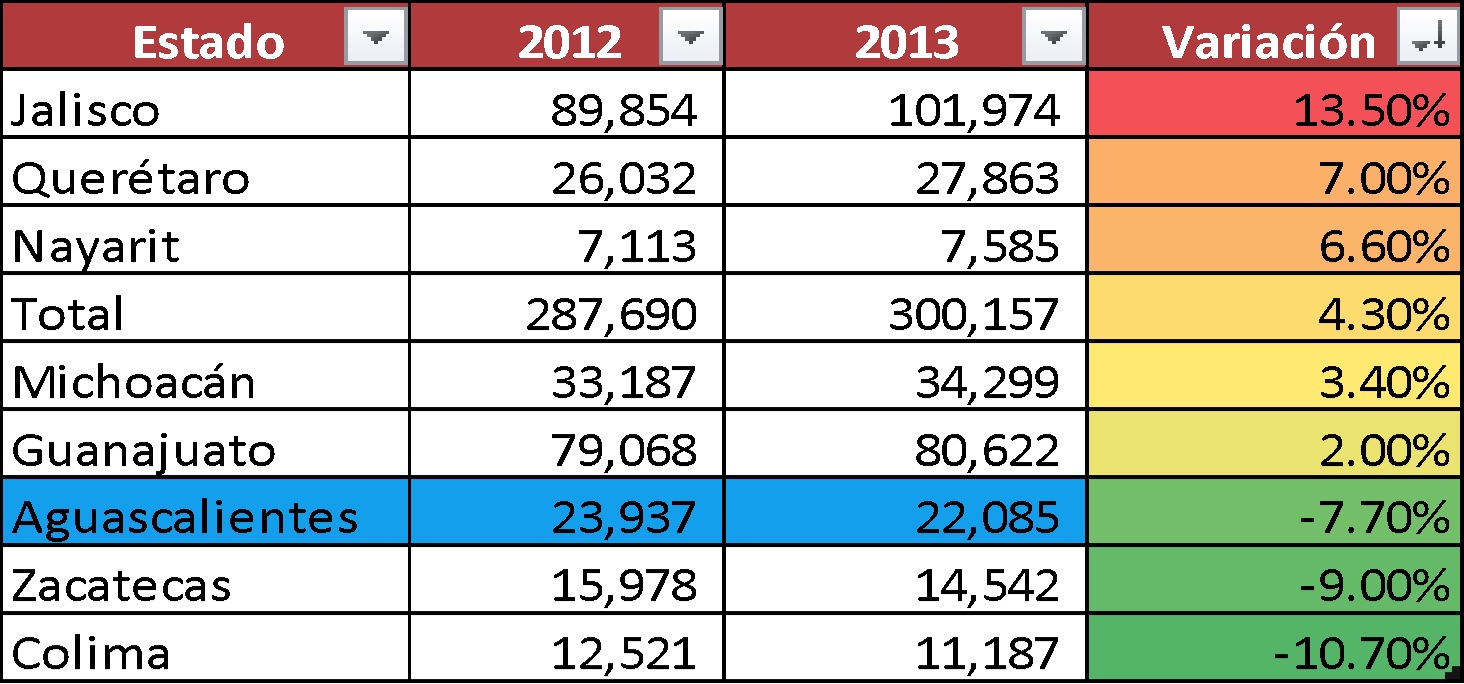 Aguascalientes pertenece a la Región Occidente y se encuentra entre las tres entidades que pudieron reducir la incidencia delincuencial del 2012 al 2013 pasando de 23 mil 937 delitos a 22 mil 85; sin embargo, las cifras locales superan en números absolutos los delitos acontecidos en Zacatecas, que cuenta con una población mayor. En la Región Occidente, Jalisco es el estado que presentó incrementos importantes, más de 12 mil (13.5%) de un año a otro, cifra superior al total de delitos cometidos en el estado de Colima que disminuyó su incidencia en un 10.7%.