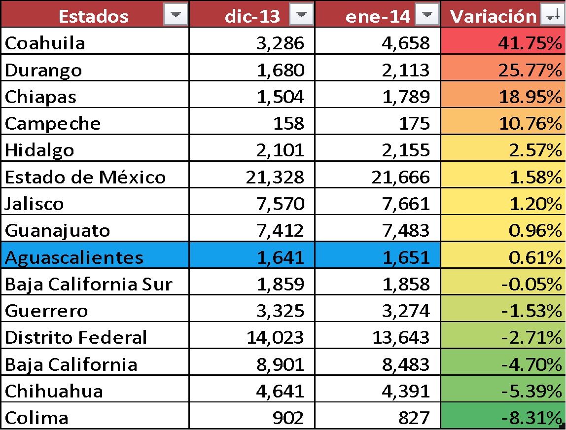 En el último comparativo mensual, del que se tiene registro con acceso público, Aguascalientes aparece entre los estados que tuvieron un incremento (menor al uno por ciento). Se acusan incrementos importantes en Coahuila, Durango y Chiapas, como ligeras disminuciones en Colima, Chihuahua y Baja California.