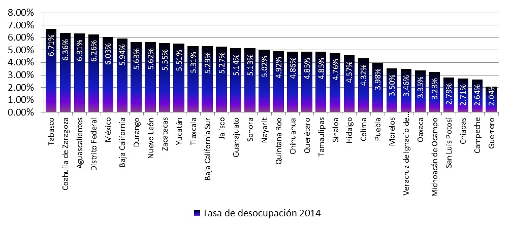 Si la tasa de desocupación nacional se ubicó en marzo en 4.8% de la PEA, hubo entidades que rebasaron esa cifra con creces. Las cinco con mayor desempleo fueron: Tabasco (7.1%), Coahuila (6.36%), Aguascalientes (6.31%), Distrito Federal (6.26%) y Estado de México (6.03%).