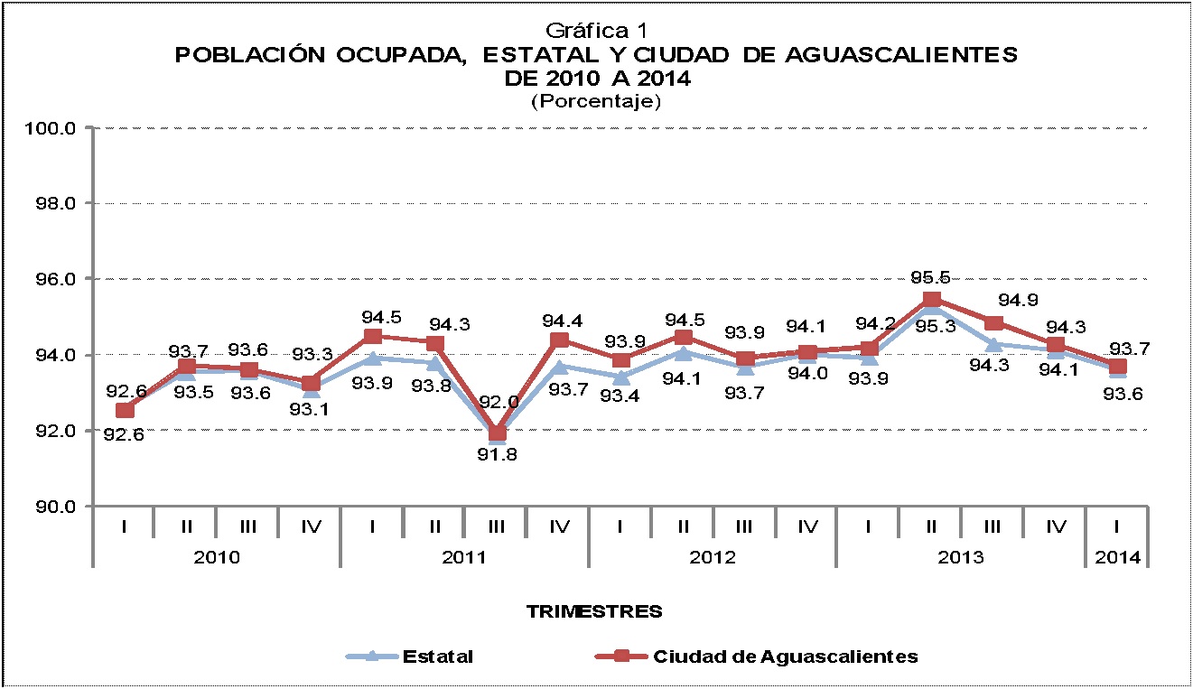 NOTA: Para el primer trimestre de 2014, la estimación de población ocupada del estado de Aguascalientes fue de 494 884, con un error estándar de 7 445 personas; la correspondiente a la ciudad de Aguascalientes fue de 345 506, con un error estándar de 6 257 personas. En ambos casos el nivel de confianza fue de 90.0 por ciento.